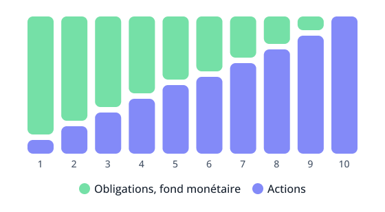 Avec 10 niveaux distincts, nous gagnons en finesse dans la répartition entre les différentes classes d’actifs sélectionnées : actions, obligations, fonds monétaires. La part d’actions — la classe d’actif la plus volatile — augmente progressivement de 10% (pour le profil 1/10) à 100% (pour le profil 10/10), avec des paliers intermédiaires de 10% chacun.
